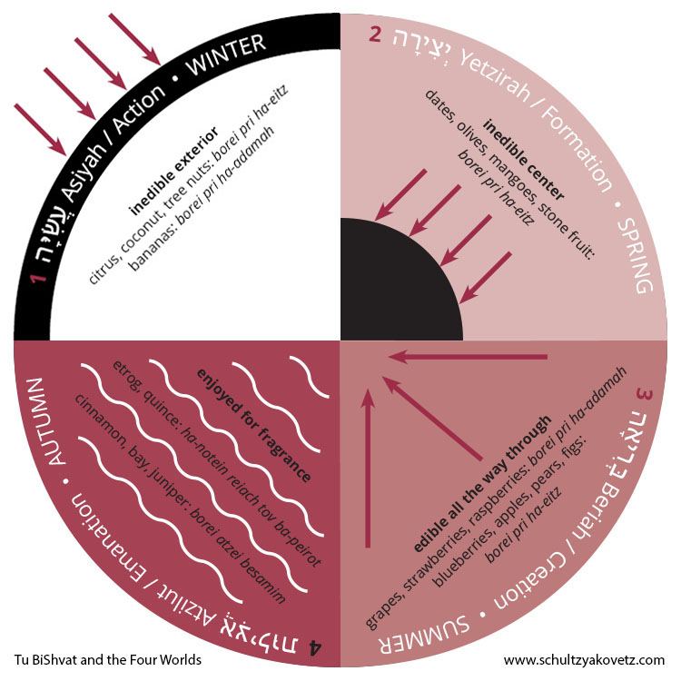 Yetzirah is represented by fruits with a soft, edible outside but a hard inner pit, because in this world, we are closer to G-d, but the center is still blocked.