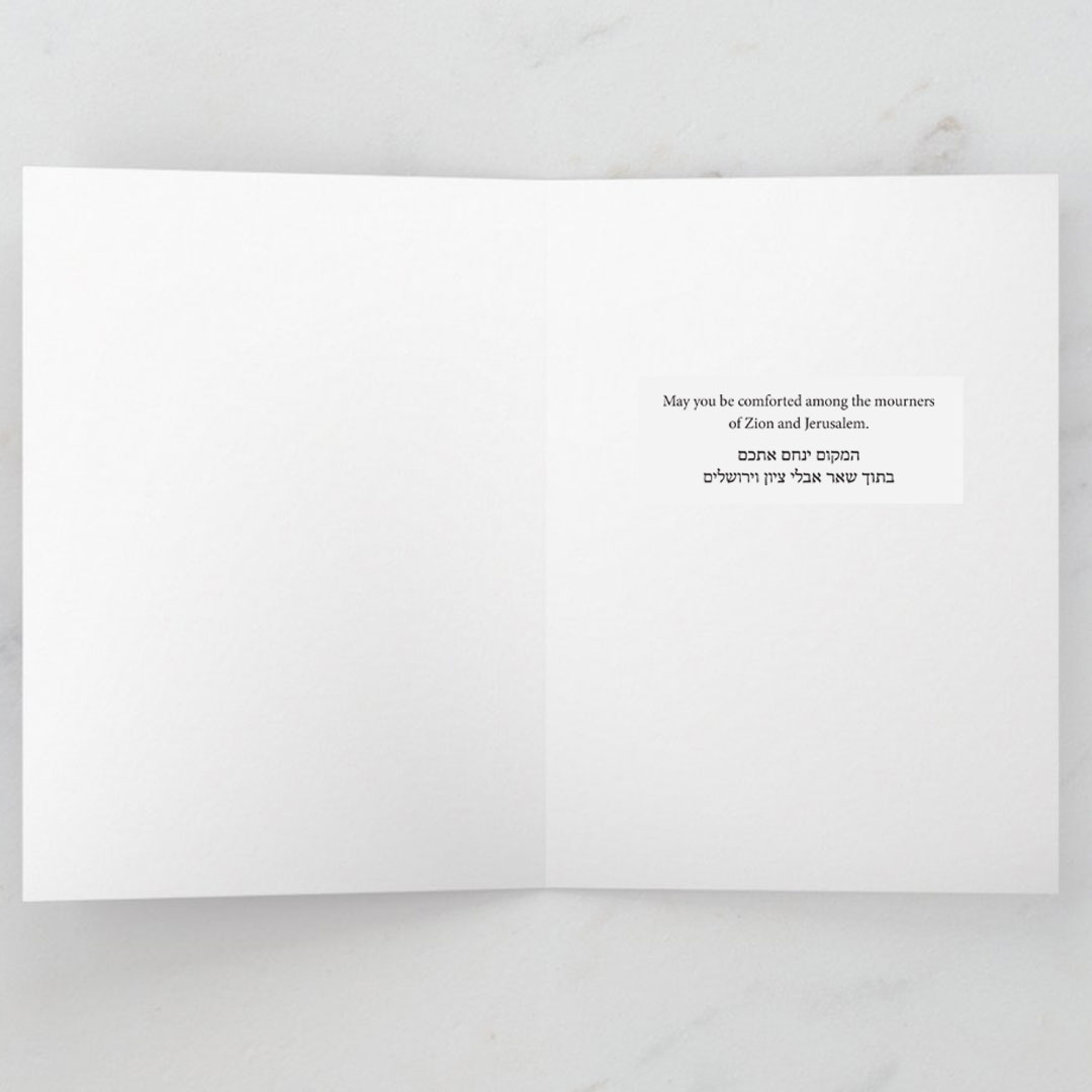 Insides of all the cards read, “May you be comforted among the mourners of Zion and Jerusalem” in English and Hebrew.