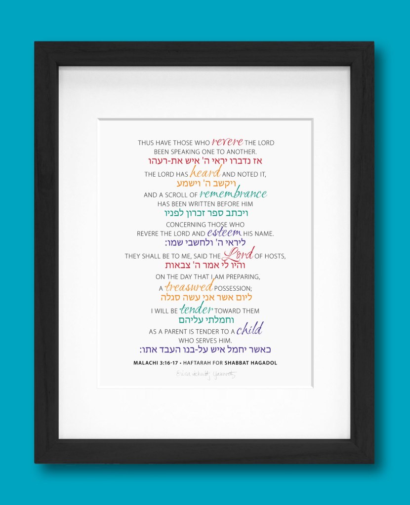 The Haftarah for Shabbat HaGadol is Malachi 3:4-24, and the day takes its name from verse 23: “Lo, I will send the prophet Elijah to you before the coming of the awesome (ha-gadol), fearful day of the Lord”. I was commissioned some years ago to create a piece from this haftarah as a bat mitzvah gift. The actual eponymous verse didn’t grab me, and it took a little digging to find a passage that would be both uplifting and memorable, but I settled on verses 16-17: